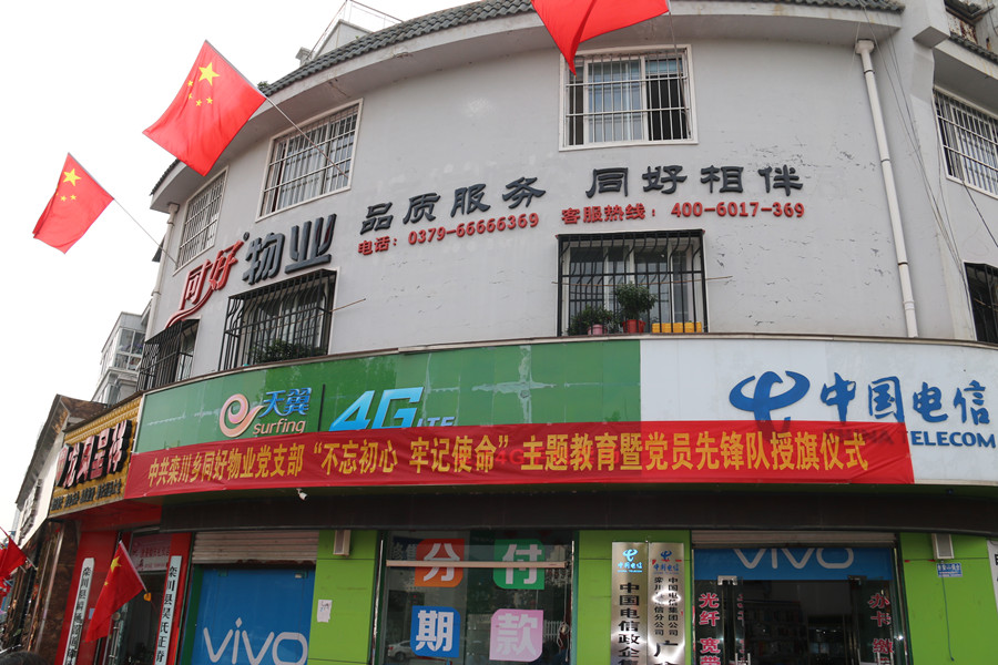 圖為中共欒川縣委組織部委派同好物業黨支部黨建指導員邢海波同志授“黨員先鋒隊”隊旗